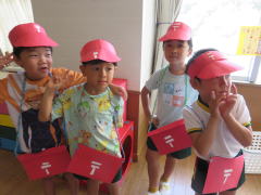 クレープ屋さん、フランクフルト屋さん、ヨーヨー釣りをしました。おばけのお面はお客さん。お財布を持ってどのお店に行こうかワクワクしていました。ハチマキをしているのはお店屋さん。「いらっしゃいませ〜!」と張り切っていました。